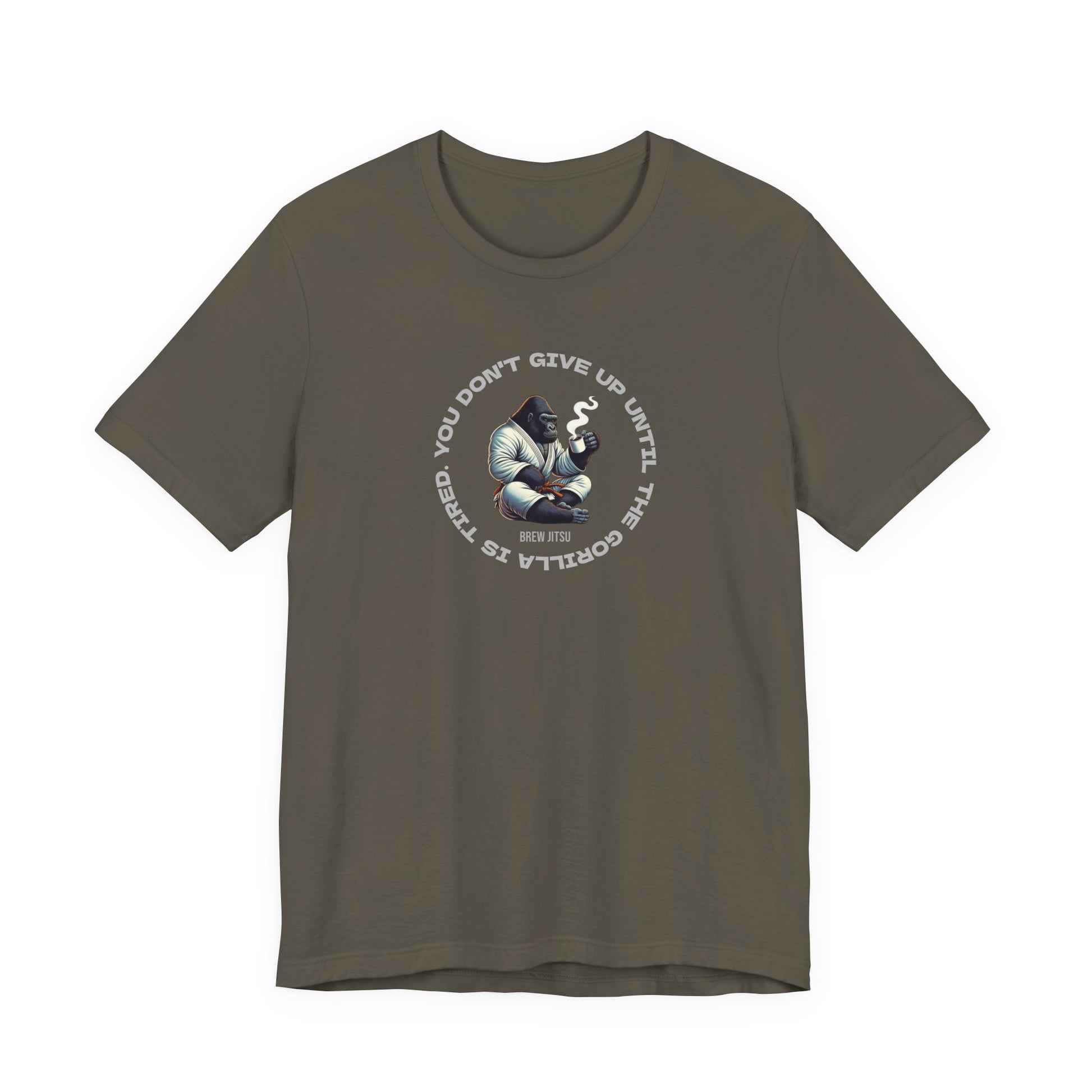 Brew Jitsu 'You Don't Give Up Until the Gorilla Is Tired' cotton t-shirt with logo on the front.